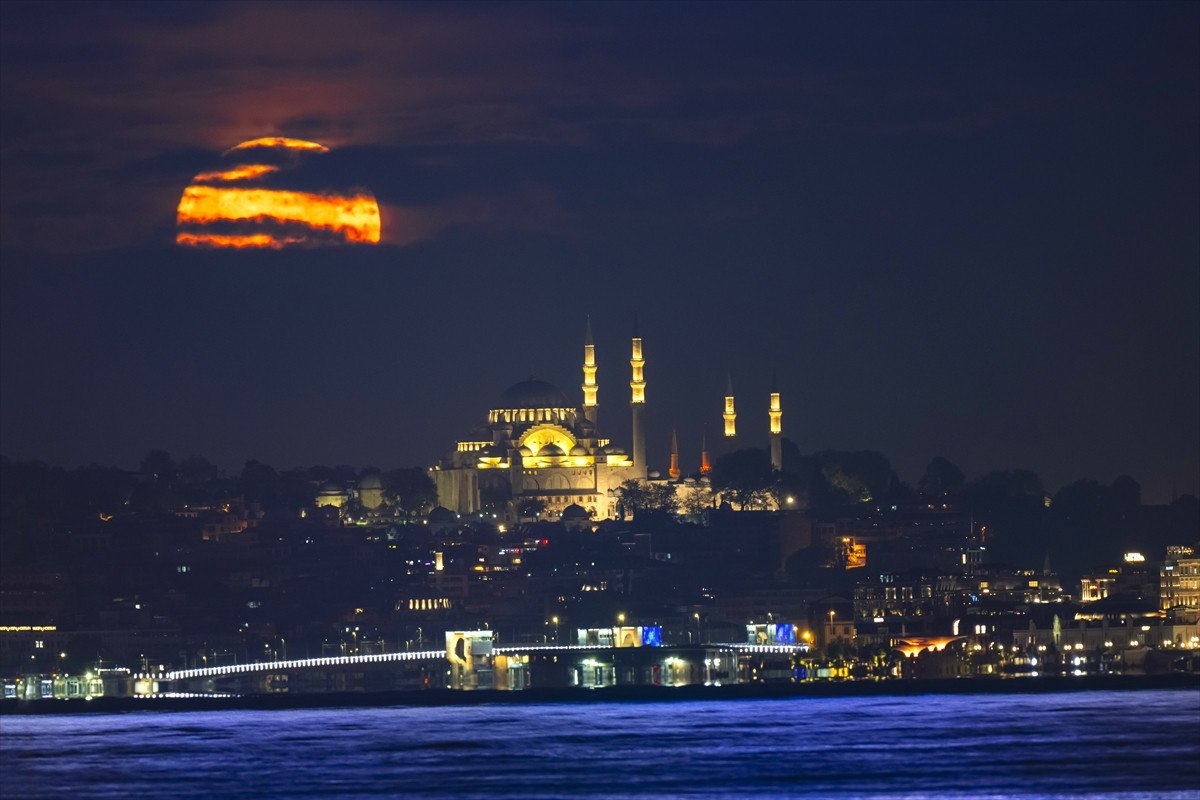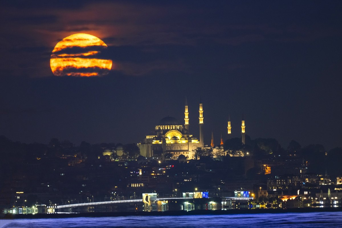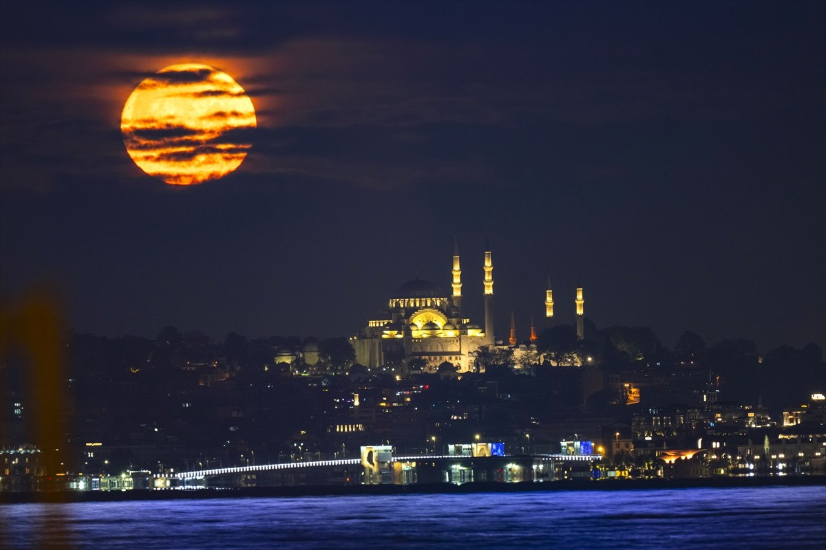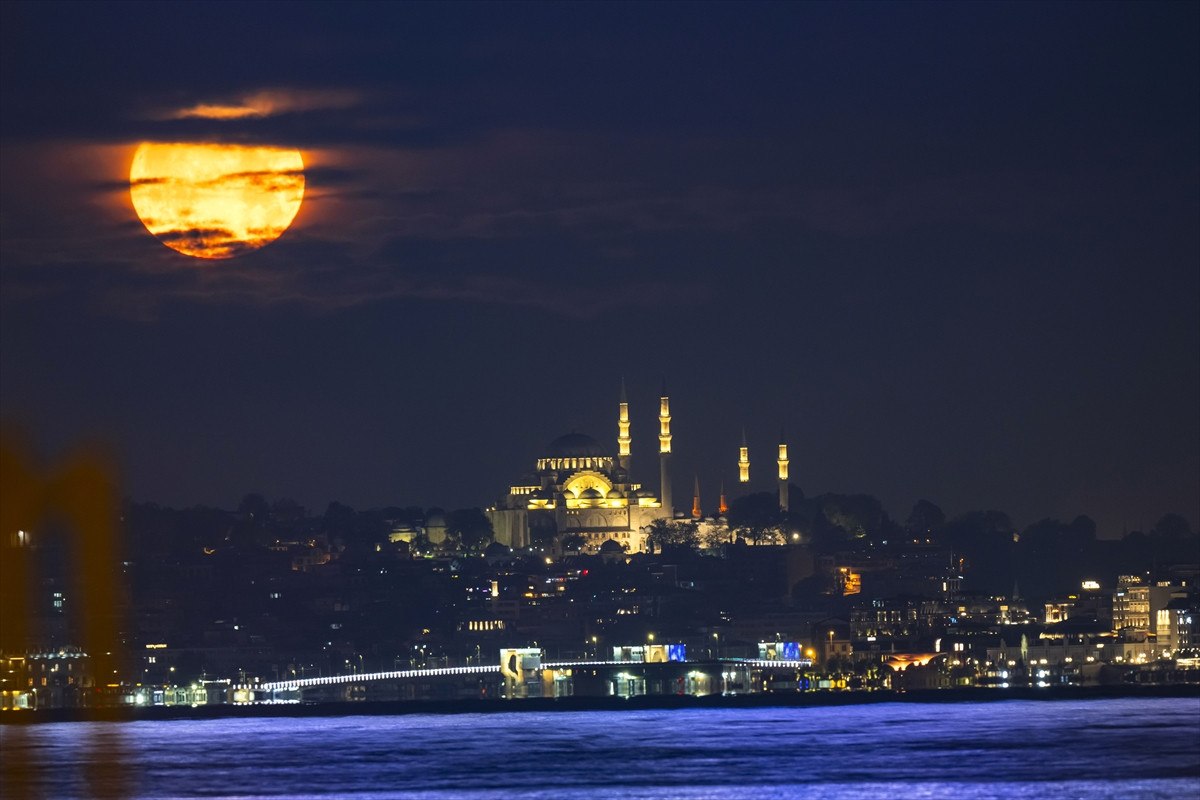 Dolunay, tarihi dokusuyla ünlü Süleymaniye Camisi ile muhteşem bir uyum içindeydi.