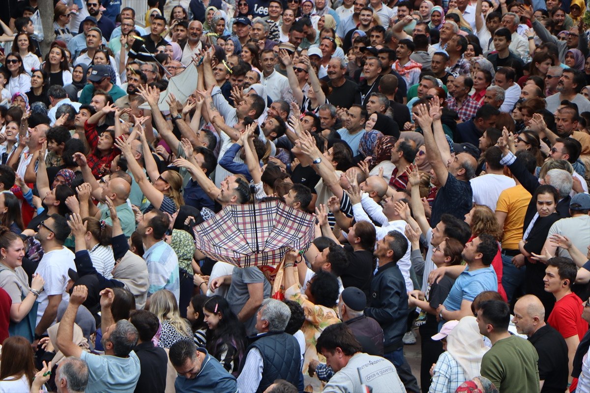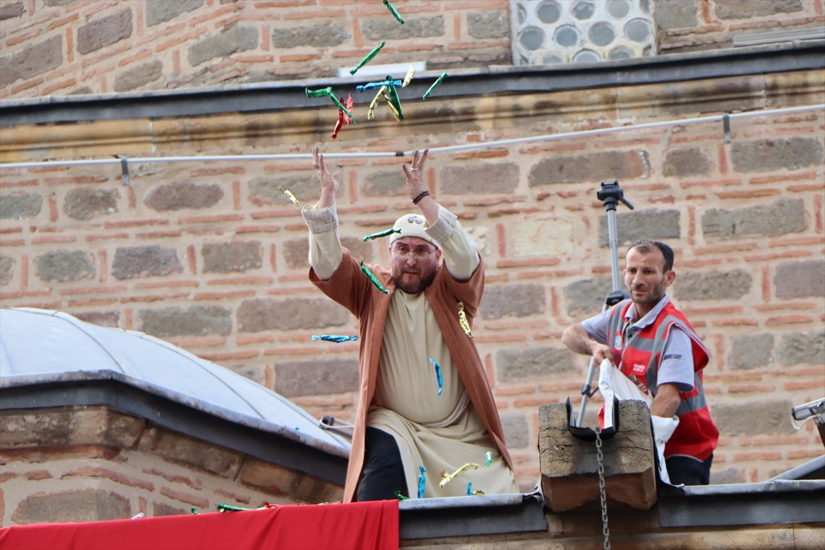 Öğle namazına müteakip temsili Hafsa Sultan'ın Merkez Efendi’ye berat vermesinin ardından Sultan Camisi'nin kubbe ve minarelerinden alanda ellerini açarak bekleyenlere şifalı macunlar saçıldı.