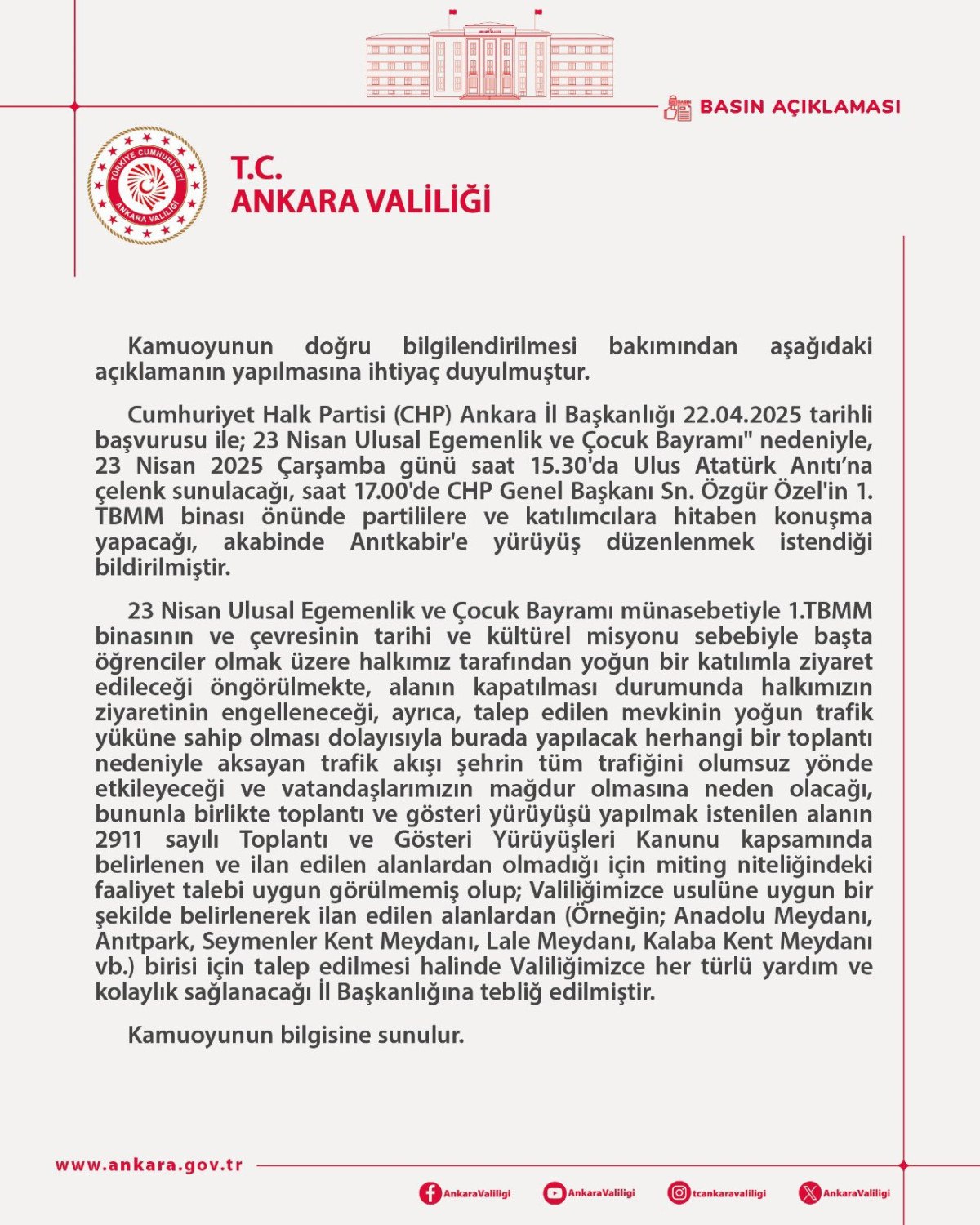 Cumhuriyet Halk Partisi (CHP) Ankara İl Başkanlığı, 22.04.2025 tarihli başvurusuyla; 23 Nisan Ulusal Egemenlik ve Çocuk Bayramı dolayısıyla, 23 Nisan 2025 Çarşamba günü saat 15.30'da Ulus Atatürk Anıtı’na çelenk sunulacağı, saat 17.00'de CHP Genel Başkanı Sayın Özgür Özel'in Türkiye Büyük Millet Meclisi binası önünde partililere ve katılımcılara hitaben konuşma yapacağı, ardından Anıtkabir'e yürüyüş düzenlenmek istendiği belirtilmiştir.